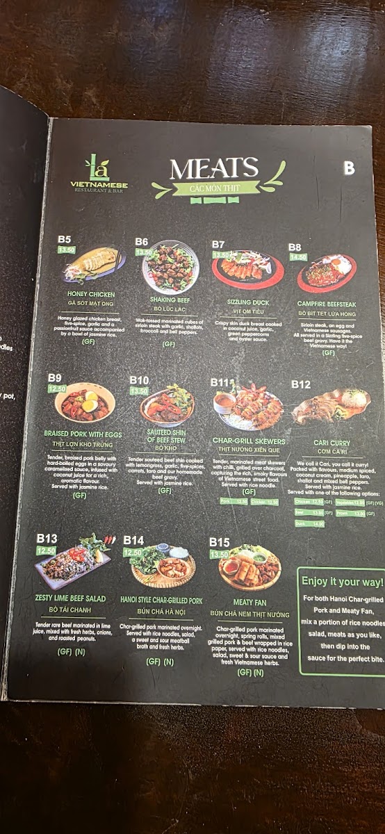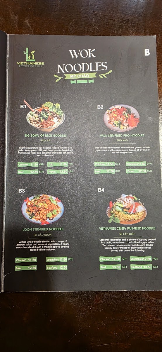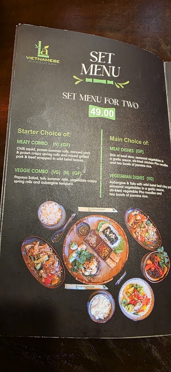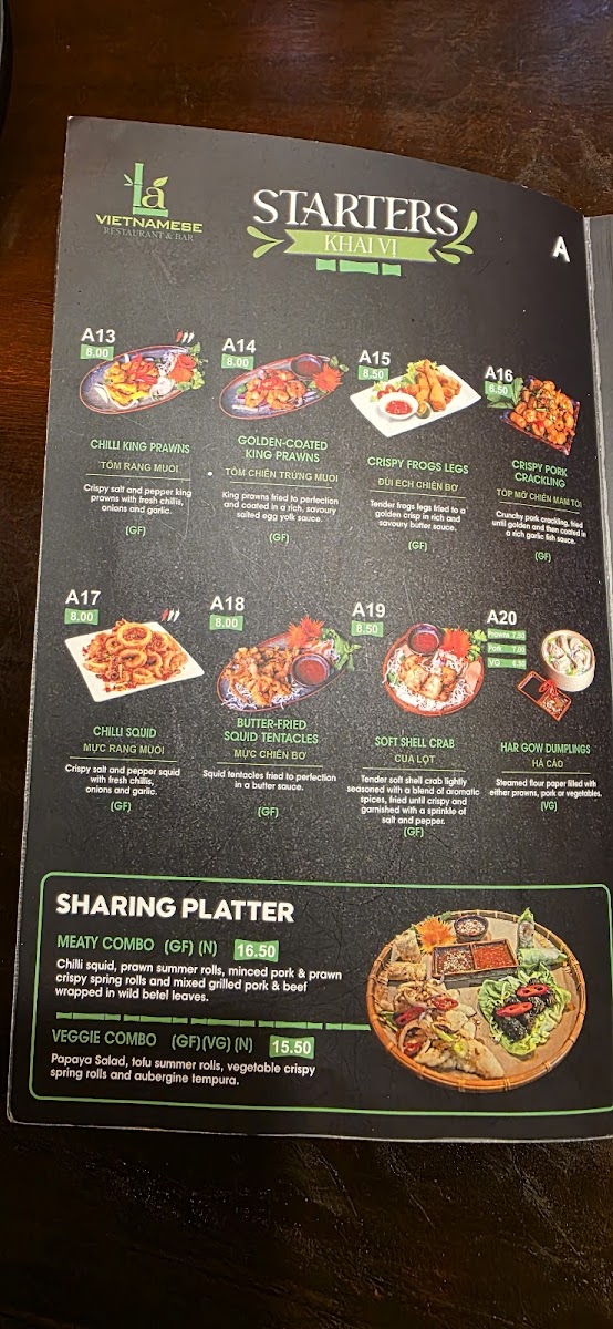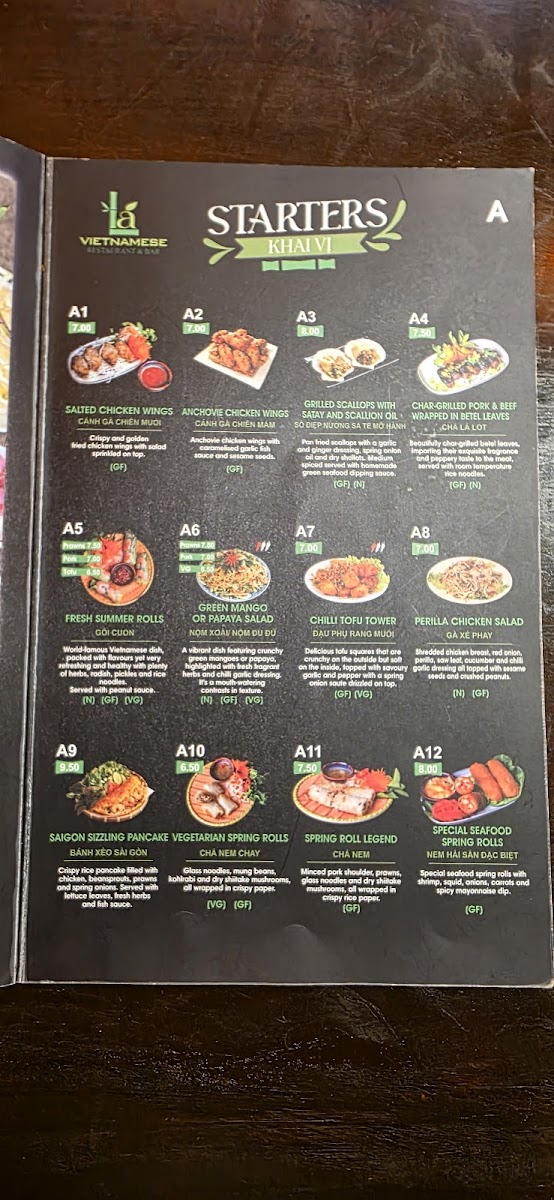 From a reviewer’s perspective, the menu at La Vietnamese Restaurant & Bar offers a vibrant and well-rounded exploration of Vietnamese cuisine, with options to suit both casual diners and those seeking a more adventurous experience. Starters like Salted Chicken Wings (Cánh Gà Chiên Muối) and Grilled Scallops with Satay and Scallion Oil (Sò Điệp Nướng Sa Tế Mở Hành) immediately set a high standard, while the Fresh Summer Rolls-Prawn (Gỏi Cuốn-Tôm) and Char-Grilled Pork & Beef Wrapped in Betel Leaves (Chả Lá Lốt) provide lighter, flavorful options. Sharing platters, including the Meaty Combo (GF) and Veggie Combo, make for a social and indulgent beginning. The Wok Noodles section impresses with bowls such as Big Bowl of Rice Noodles-Prawn (Bún Sả-Tôm) and Wok Stir-Fried Pho Noodles-Chicken (Phở Xào-Gà), pairing rich broths with fresh ingredients. Main courses highlight standout meats like Shaking Beef (Bò Lúc Lắc), Sizzling Duck (Vịt Om Tiêu), and Braised Pork with Eggs (Thịt lợn Kho Trứng), while seafood lovers are treated to Tiger Prawn Tempura (Tôm Chiên Xù) and Hanoi’s Famous Turmeric Grilled Fish (Chả Cá Lã Vọng Hà Nội). The broth and noodle soups, from Special Pho (Phở Đặc Biệt) to Vegetarian Pho (Phở Chay), showcase the depth of traditional Vietnamese flavors, complemented by special dishes like Beef Grilled on Highland Rocks (Bò Nướng Đá Tây Nguyên) and Prawns Grilled with Salt and Chilli (Tôm Nướng Muối Ớt). Sides such as Garlic Pak Choi Saute (Cải Ngọt Xào Tỏi) and Crispy Fried Corn (Ngô Chiên) add freshness and texture, while desserts, including Luxury Chocolate Cake and Coconut Ice-Cream with Pandan Sticky Rice, provide a sweet finish. The menu’s balance of traditional Vietnamese dishes and creative twists, along with options for sharing and set menus, makes it clear that every diner can find something to delight the palate. Overall, La Vietnamese Restaurant & Bar presents a menu that is both comprehensive and inviting, offering flavors that are authentic yet accessible, making it a standout destination on High Street, Doncaster.