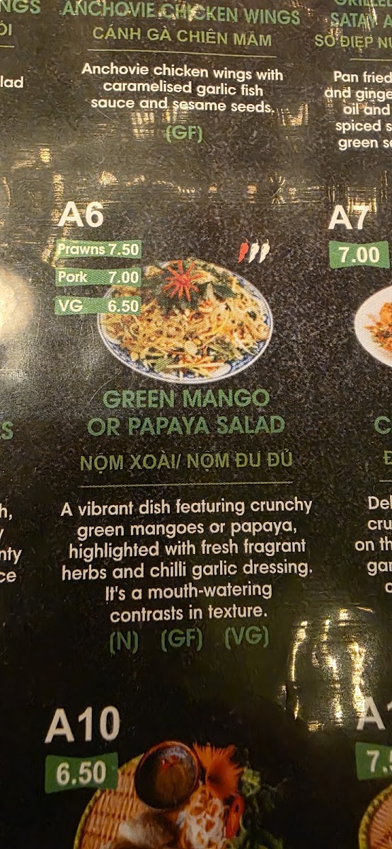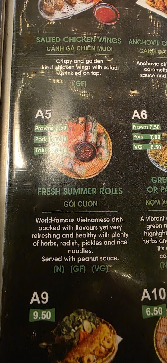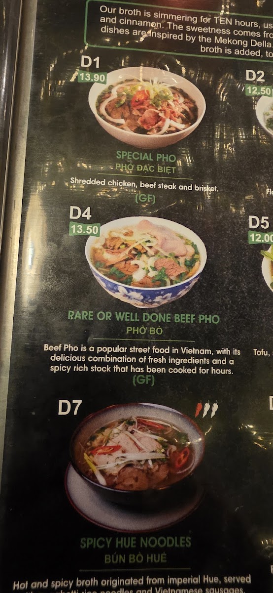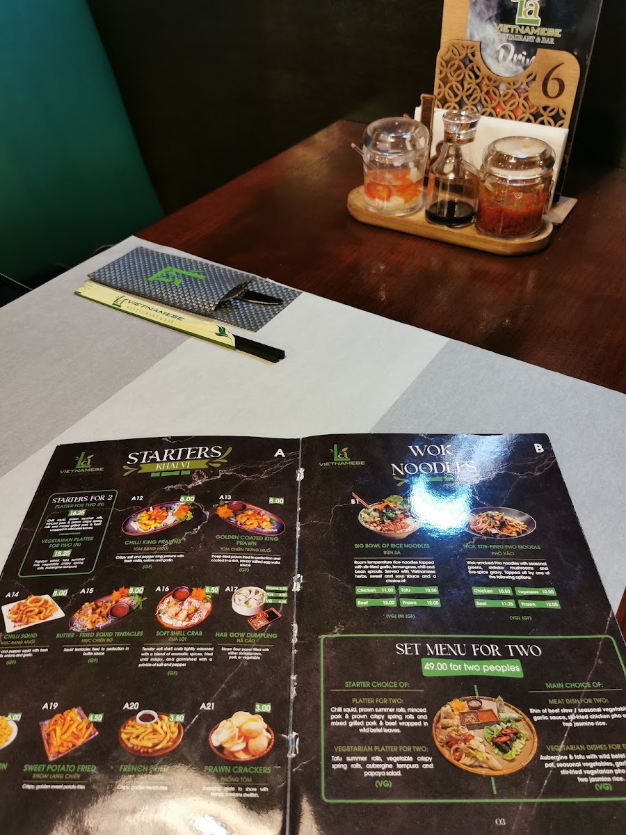 From a reviewer’s perspective, the menu at La Vietnamese Restaurant & Bar offers a vibrant and well-rounded exploration of Vietnamese cuisine, with options to suit both casual diners and those seeking a more adventurous experience. Starters like Salted Chicken Wings (Cánh Gà Chiên Muối) and Grilled Scallops with Satay and Scallion Oil (Sò Điệp Nướng Sa Tế Mở Hành) immediately set a high standard, while the Fresh Summer Rolls-Prawn (Gỏi Cuốn-Tôm) and Char-Grilled Pork & Beef Wrapped in Betel Leaves (Chả Lá Lốt) provide lighter, flavorful options. Sharing platters, including the Meaty Combo (GF) and Veggie Combo, make for a social and indulgent beginning. The Wok Noodles section impresses with bowls such as Big Bowl of Rice Noodles-Prawn (Bún Sả-Tôm) and Wok Stir-Fried Pho Noodles-Chicken (Phở Xào-Gà), pairing rich broths with fresh ingredients. Main courses highlight standout meats like Shaking Beef (Bò Lúc Lắc), Sizzling Duck (Vịt Om Tiêu), and Braised Pork with Eggs (Thịt lợn Kho Trứng), while seafood lovers are treated to Tiger Prawn Tempura (Tôm Chiên Xù) and Hanoi’s Famous Turmeric Grilled Fish (Chả Cá Lã Vọng Hà Nội). The broth and noodle soups, from Special Pho (Phở Đặc Biệt) to Vegetarian Pho (Phở Chay), showcase the depth of traditional Vietnamese flavors, complemented by special dishes like Beef Grilled on Highland Rocks (Bò Nướng Đá Tây Nguyên) and Prawns Grilled with Salt and Chilli (Tôm Nướng Muối Ớt). Sides such as Garlic Pak Choi Saute (Cải Ngọt Xào Tỏi) and Crispy Fried Corn (Ngô Chiên) add freshness and texture, while desserts, including Luxury Chocolate Cake and Coconut Ice-Cream with Pandan Sticky Rice, provide a sweet finish. The menu’s balance of traditional Vietnamese dishes and creative twists, along with options for sharing and set menus, makes it clear that every diner can find something to delight the palate. Overall, La Vietnamese Restaurant & Bar presents a menu that is both comprehensive and inviting, offering flavors that are authentic yet accessible, making it a standout destination on High Street, Doncaster.
